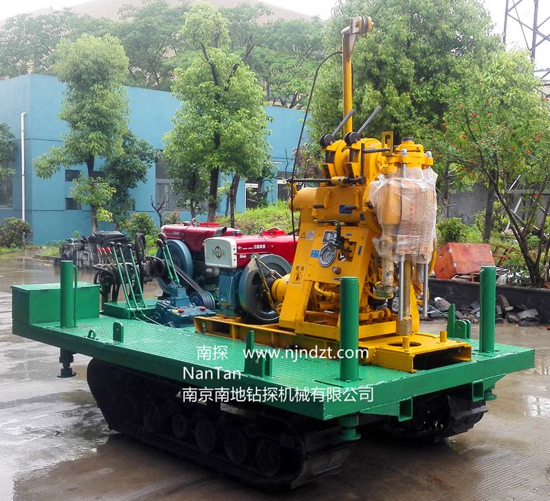 一、簡(jiǎn)介 XY-1-L-01-A(B)型履帶鉆機(jī)及人字形四角架鉆塔,是將橡膠履帶底盤、動(dòng)力(柴油機(jī)或電機(jī))、鉆機(jī)、A型為4組手動(dòng)支撐腿B型為4組液壓支撐腿、鉆機(jī)平臺(tái)、6米高人字形四角架起落鉆塔、水泵等共同組裝在一個(gè)機(jī)架上。鉆機(jī)、水泵一個(gè)動(dòng)力(柴油機(jī)或電機(jī)),橡膠履帶底盤一個(gè)動(dòng)力(柴油機(jī)或電機(jī))帶動(dòng),互不干擾。該機(jī)型具有爬坡能力強(qiáng)、鉆進(jìn)和行走穩(wěn)定可靠、載重質(zhì)量大等優(yōu)點(diǎn),適用于地質(zhì)、冶金、煤炭、水文、建筑工程、水電工程、公路、鐵路、港口、城建、橋梁、壩基等建筑物的工程地質(zhì)勘察、淺層探礦、礦山坑道、水井、小型灌漿孔、爆破孔等的鉆進(jìn)。該鉆機(jī)是適應(yīng)新型市場(chǎng)需求不可多得的理想設(shè)備之一。可在海灘、河灘、沙地、水田等惡劣環(huán)境開(kāi)展靜探作業(yè),結(jié)冰道路仍可行走。