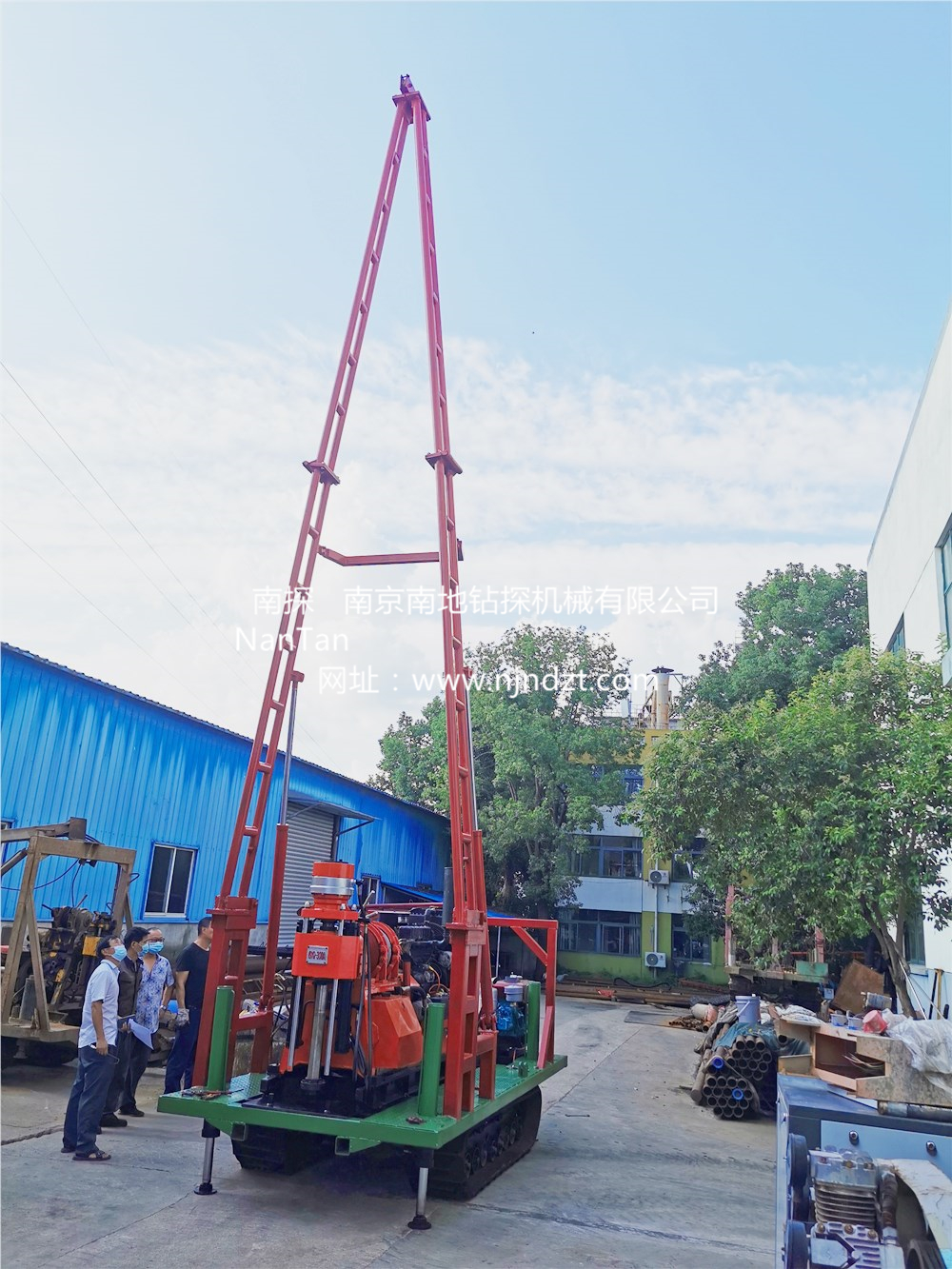 鉆機機組由履帶底盤、柴油機、升高型液壓支腿、鉆機、折疊式液壓起落鉆塔組成,共同組裝在一個機架上。鉆機可以選擇柴油機或電動機、履帶底盤及液壓支腿由獨立柴油機帶動、互不干涉。